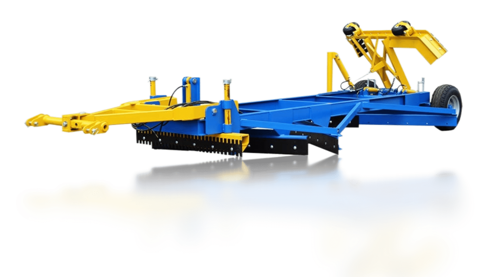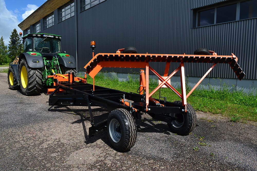Grader GJ 2.4 is designed to be used as a working implement for smoothing and profiling gravel-covered roads. The grader has three smoothing blades and one loosening blade in the front (hydraulically controlled) and a rear stone blade. The stone blade is hydraulically lifted and rests on adjustable support wheels. The grader rests on the tractor’s hitch device and two support wheels. The support wheels are separately controlled by a hydraulic cylinder. To create road slope, the support wheels are adjustable with a separate screw mechanism.